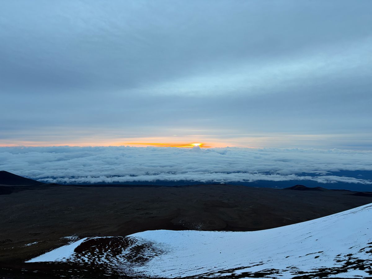 参加したのは2月でした。山頂の途中までは曇天、ビジターセンターを出発してしばらくは雪が降っていて、とてもハワイ島の天気とは思えなかったです。山頂に着いてすぐはまだ雪が降っていましたが、ガイドさんに今日は見れると思いますよ。と言われて、本当に雲が晴れて、雪と雲海とサンセットと全てが揃った今まで経験したことのない、最高の景色を見る事が出来ました。満天の星空はプラネタリウムよりも沢山の星を観ることが出来ました。ガイドさんにはサンセットも星空も沢山の写真を撮ってもらえて、自分の携帯では撮れないような写真を撮ってもらえた事も思い出になって、嬉しかったです。また、高山病にかからないように配慮もしっかりしていて安心して参加する事が出来ました。