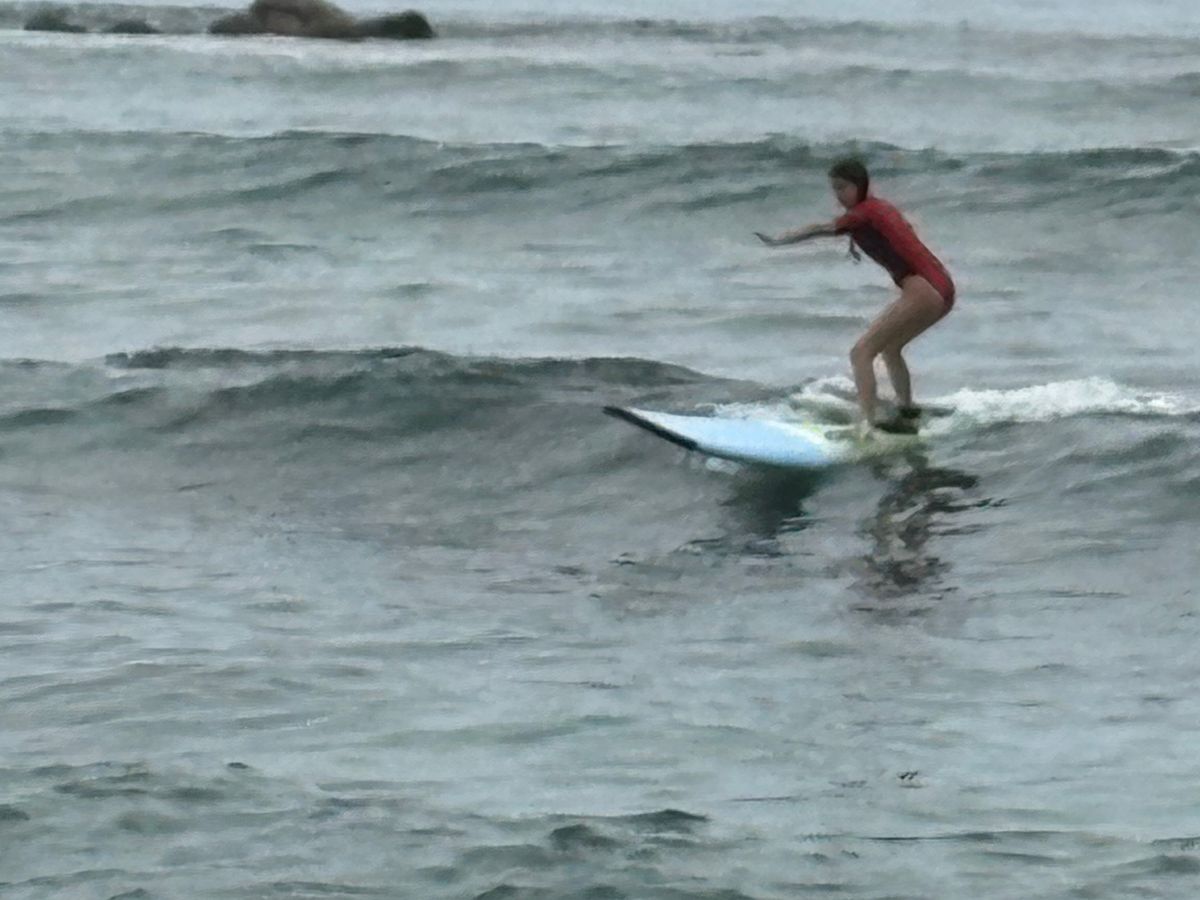 その日は波のコンディションがあまり良くない状況でしたが、インストラクターが波に乗るタイミングを的確に出してくれたお陰で一本目からボードの上に立つことが出来ました!