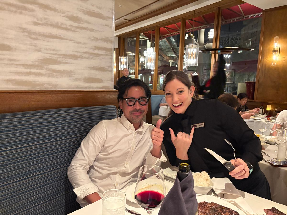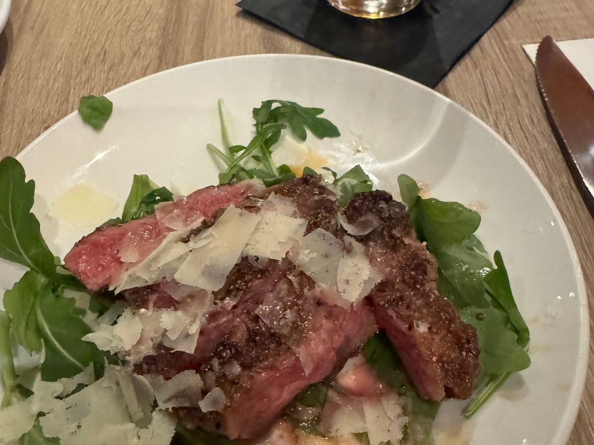 ホテルから近かったのでこの店を予約しました。マラソン完走シャツを着て行ったので、話も弾み楽しく食事を取ることができました。あらかじめ予約した席はとびこみの席より1段高いフロアーの席でゆっくりしていたので落ち着いて良い雰囲気でした。頼んだステーキはアツアツではなく少し残念でした。肉は厚くて食べるのは難儀しました。