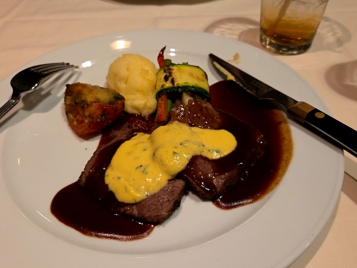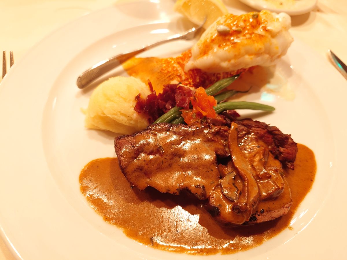 お食事は最初にサラダが出てきて、リブ、そしてロブスターとポテトがワンプレートになって提供されました。おいしかったです。ボリュームもあって、おなか一杯でした。