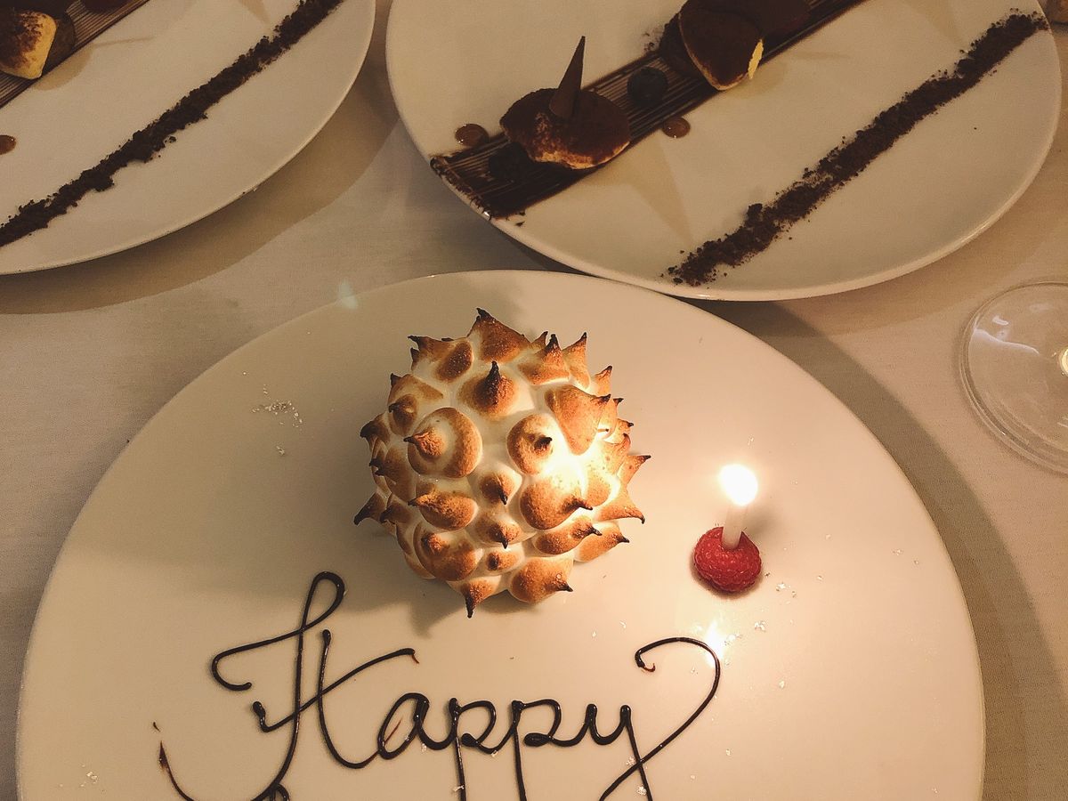すると、コースのデザートとは別にお誕生日プレートのマシュマロを焼いたケーキを頂きました。お腹一杯でしたが、別腹で頂きました。