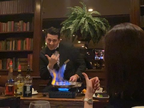 今回3回目です。レセプションの女性に、普通のメニューを予約した観光客と思われ、2人がけの隅の席に通されたのですが、天井の照明がチカチカすることと、ベルトラさんを通してコースを頼んだことを伝えたところ、通り沿いの景色の良い、角席に案内してくれました。前菜のシュリンプカクテルで少しお腹いっぱいになったのですが、カクテルを飲みながらお肉を待ってたら、変わらずのボリュームのTボーンステーキ。マッシュポテトとほうれん草のマッシュがサイドに付き、はじめウエイターさんが取り分けてくれ、とても親切でした。