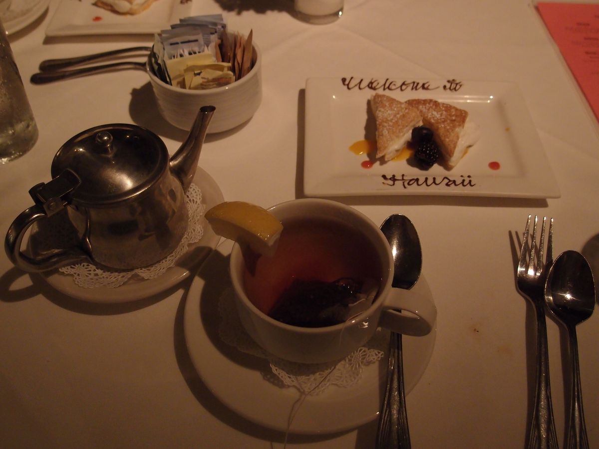 また、事前に今回のハワイは特別な旅行だという事を伝えてあったので、サプライズのデザートとして「flaming strawberries」をサービスで用意して頂きました。