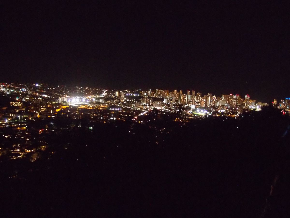 その後にタンタラスの丘に行き、夜景観賞を行いました。道端から見るようなレベルの夜景観賞ですが、たまたま金曜日でワイキキ海岸の方で花火が上がっているのも見ることができました。