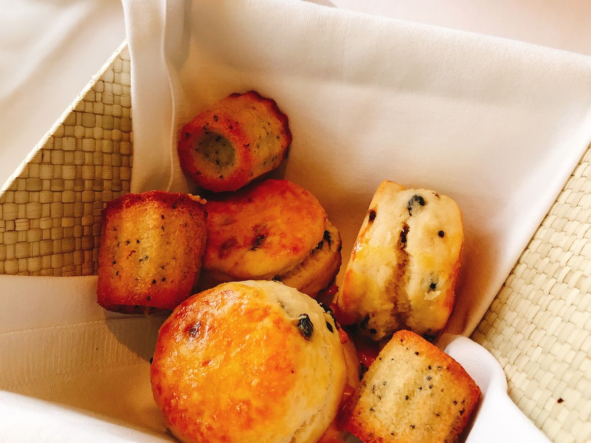 パンは3種類あり、おいしかったです。デザートはチョコレートケーキとチーズケーキでしたが、コーヒーが熱々じゃなかったので残念でした。