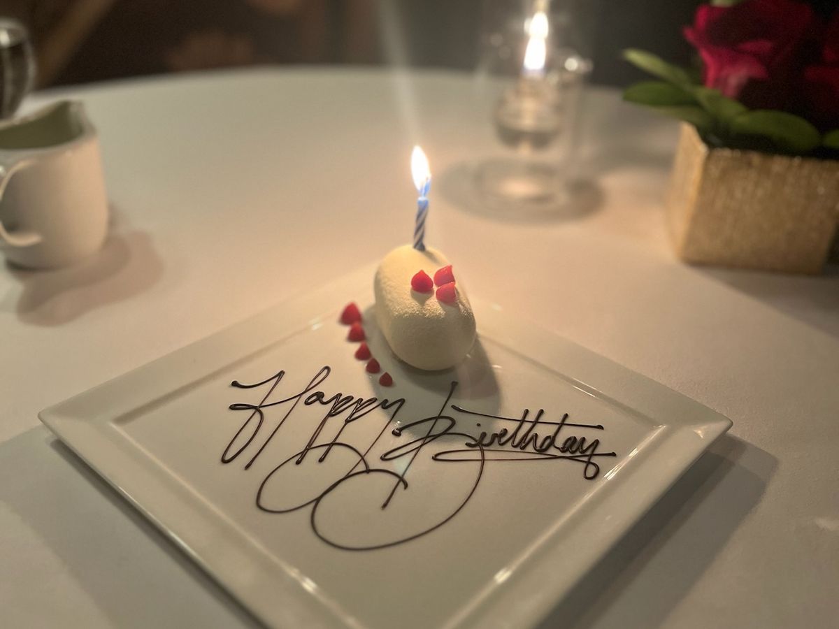 ですが当日デザートのあともプレートが来ることはなく、夫がトイレに行ってる時にスタッフに伝えると、夫が帰ってきた後テーブルの担当スタッフが 誕生日なんですね、ケーキは2つ?1つにする?と聞いて、そのあと結構大きめのチョコケーキにチョコプレートが乗ったお皿が来ました。