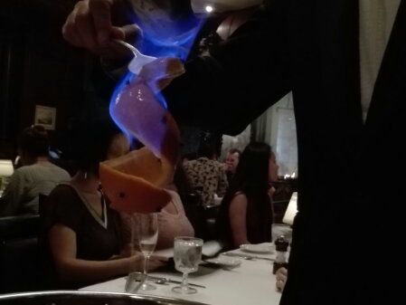Tボーンステーキはさすがの大きさ。目の前で切り分けてくれました。二人で食べるのはかなりきつかったですが、デザートまでしっかり完食しました。デザートも目の前で調理してくれて、フランベの炎がきれいでした。