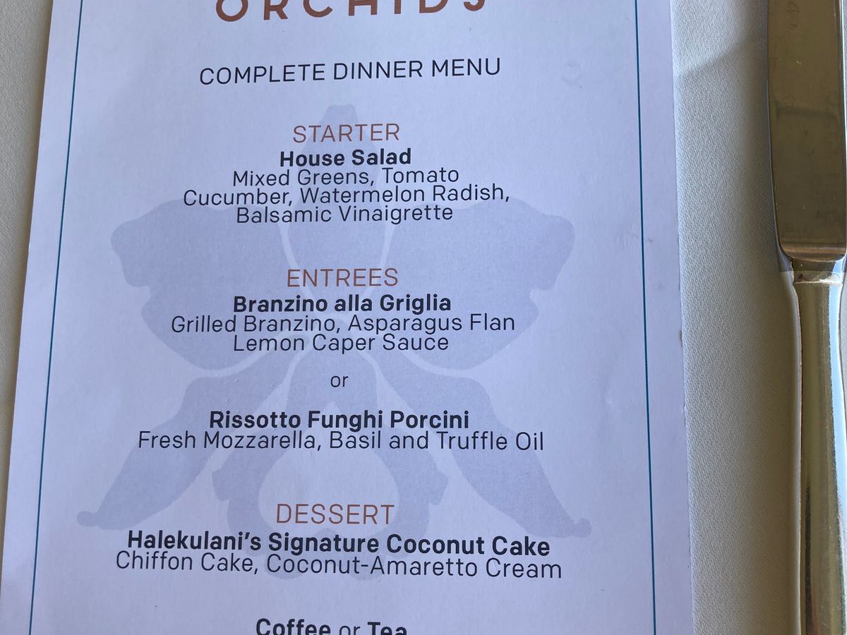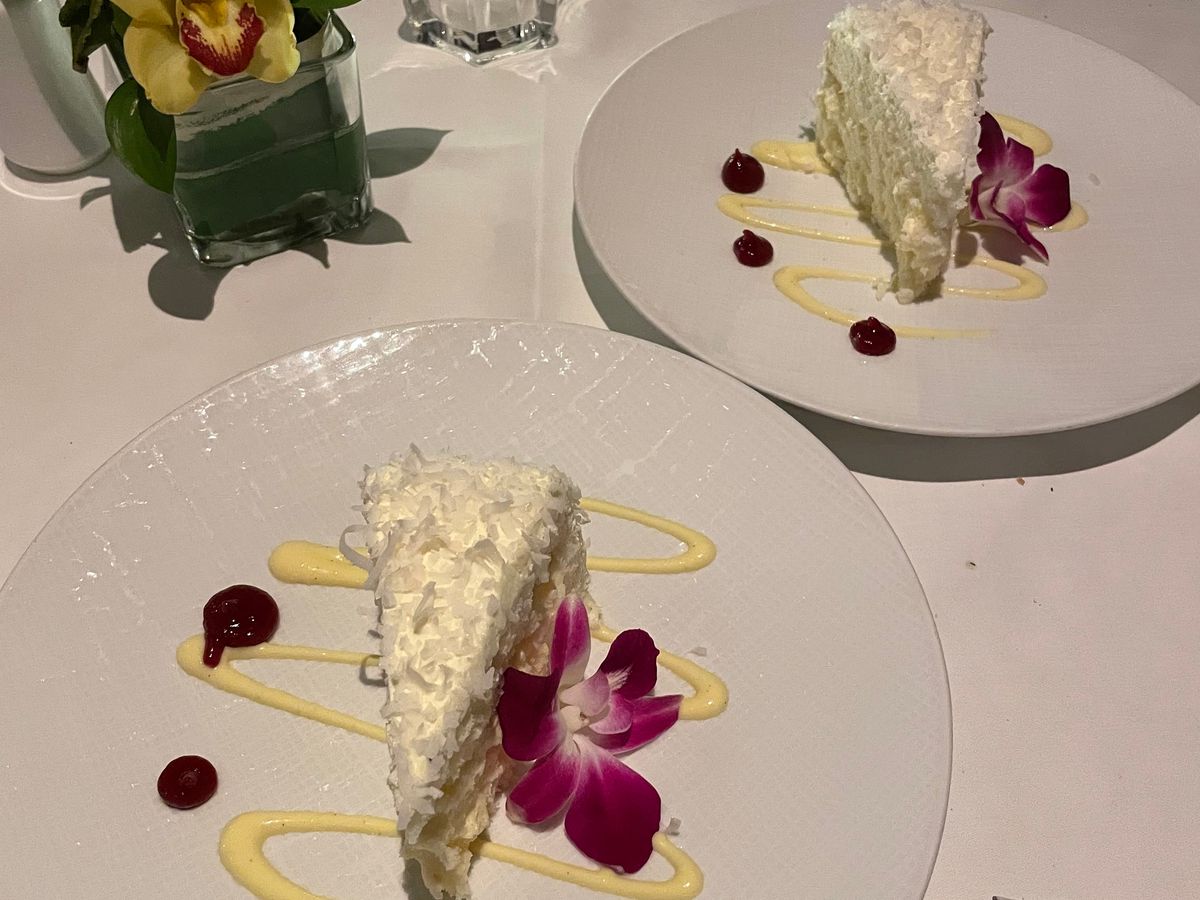 お食事はどれも大変美味しく夫はビーフ私はフィッシュをメインディッシュに頼みました。両方オススメです。良質な食材で大変良いお味でした。 最後はお楽しみのハレクラニオリジナル ココナッツケーキは2人で大絶賛です。甘すぎず上品なケーキでした。 また訪れたいディナーでした。