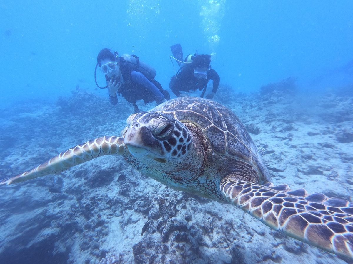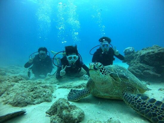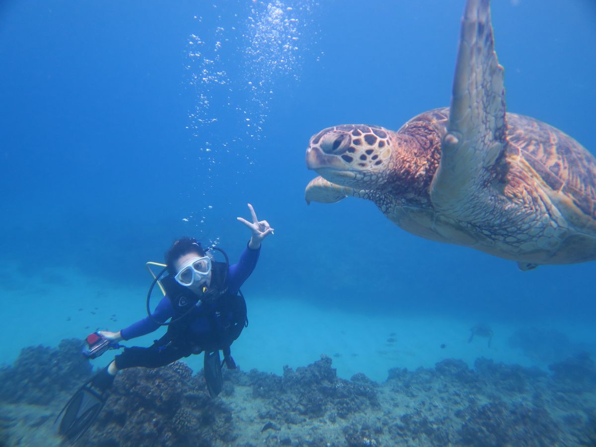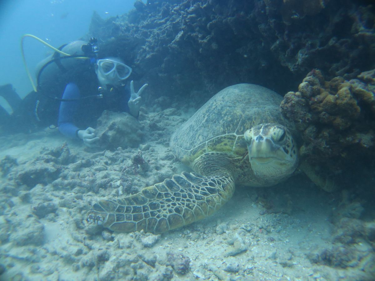 ウミガメと遭遇できる可能性が高いとのことで参加しました。いままでのダイビングではマンタ、ジンベイザメに遭遇できなかったり、イルカも遠くを泳いでいるのを見るだけで、期待通りのダイビングはありませんでした。今回も期待通りにはならないかもと思っていましたが、ウミガメが居るは居るは、また顔を見合わせるほど大接近できるなんて期待以上で感激しました。ウミガメってなんてかわいいのでしょう。スタッフのみなさんのおかげで、安心してもぐれました。ありがとう御座いました。次に訪れた時もまた参加したいです。