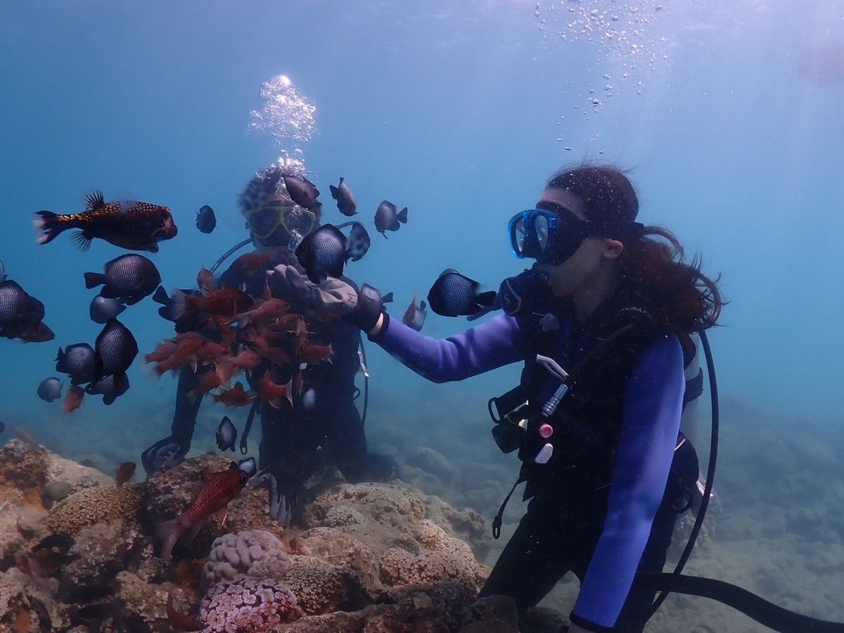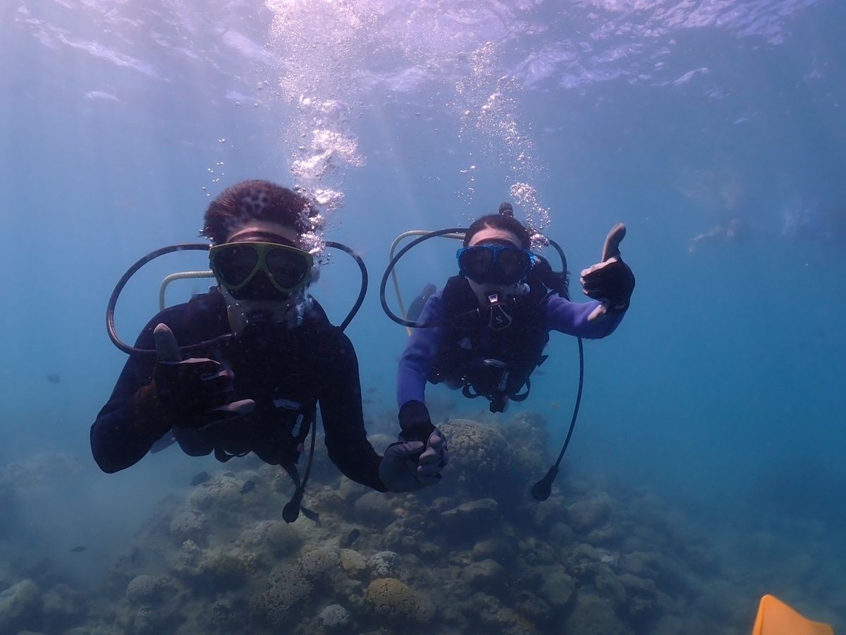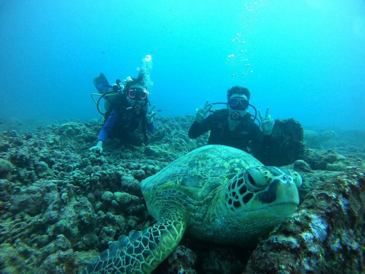 新婚旅行で参加しました!初心者&ほぼ初心者だったため、ちゃんと潜れるか心配でしたが、インストラクターの人がしっかり教えてくれたので楽しく潜ることができました!ウミガメも見る事が出来て最高です!