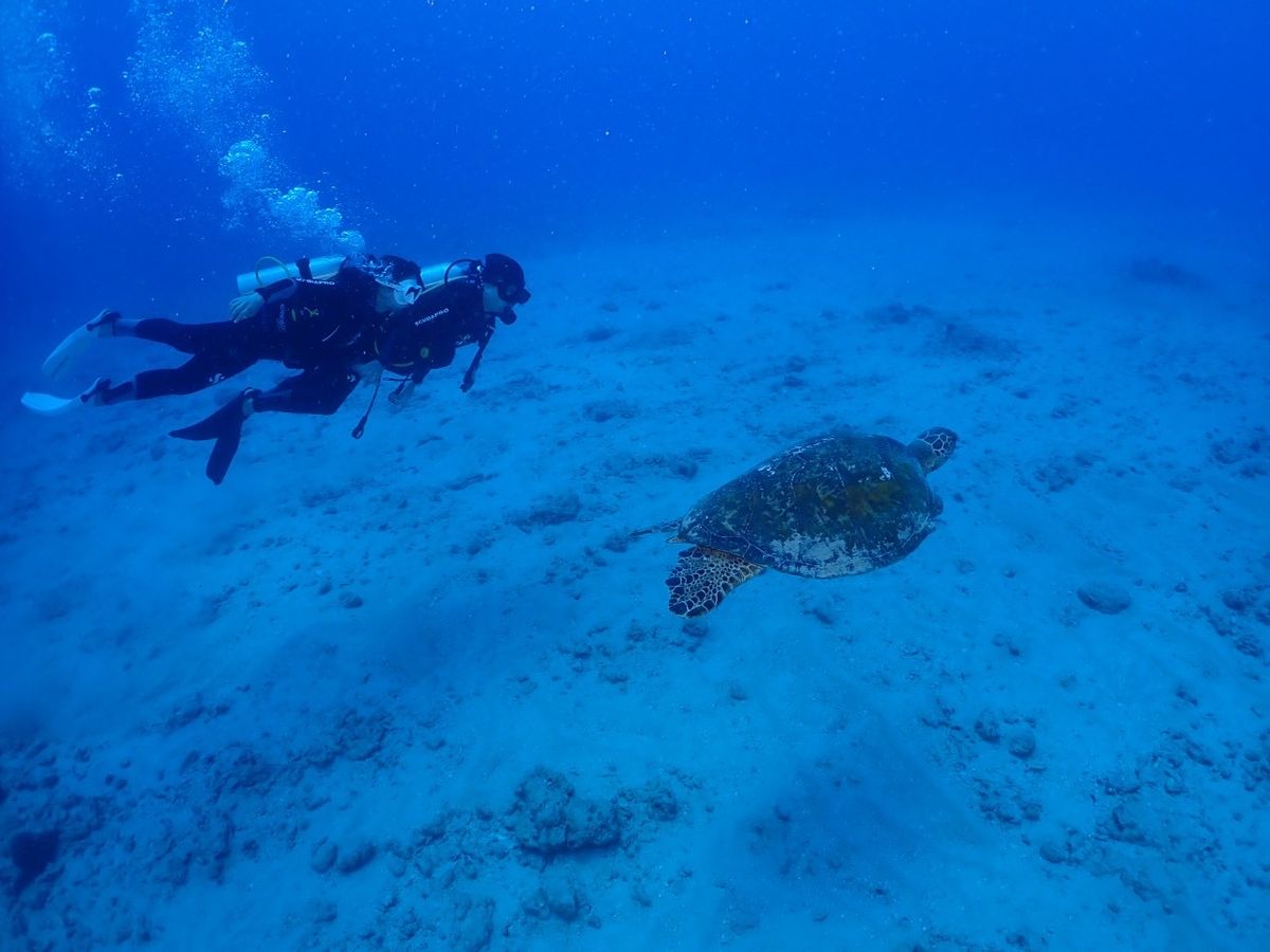 パートナーと2人で初めてのダイビングを体験しました。陸でマスクの付け方や呼吸法など基本的なことを教えてもらったあと、船に乗り込み1回目は基本的な泳ぎ方メインに、2回目はウミガメ鑑賞メインに泳ぐという流れでした。ヒロさん(インストラクターさん)は教え方がとても分かりやすく、水中でもサインやボードを使いコミュニケーションを取ってくれるので、初めてでもとても安心して泳ぐことができました。