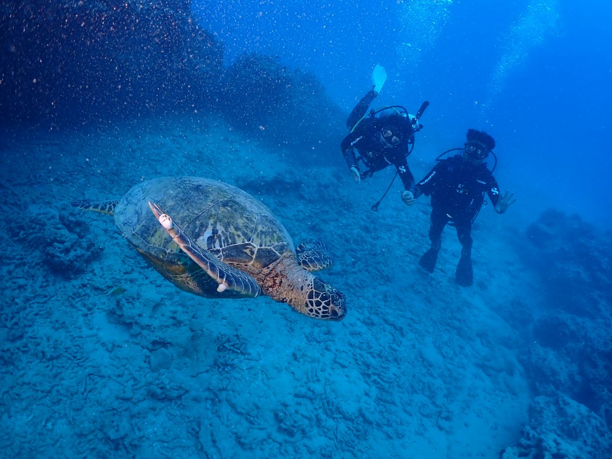 久しぶりのダイビングだったので体験ダイビングに参加しました。イントラのアツシさんの人柄も良く、一緒に参加した方々もお話しやすい方々ばかり。潜行ロープの真下に大きなウミガメいるし、休憩中も息継ぎにきたウミガメを数回見れました。なかなかの高確率での遭遇にテンションあがりまくり!非常に良いひとときでした。次にハワイでダイビングするならやはりアロハナダイバーズさんを選びますね。