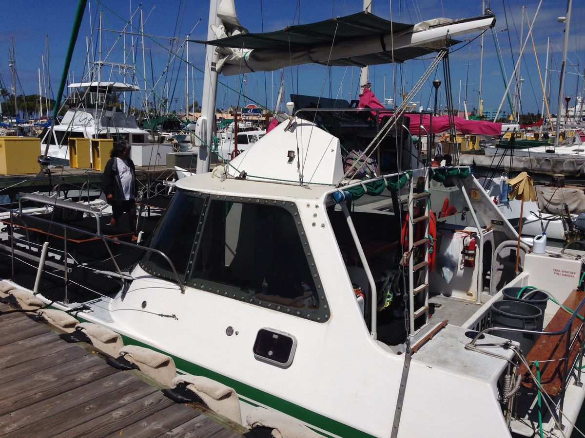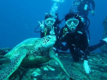 主人は3年のブランク、私は2年のブランクでした。ブランクがあっても大丈夫と書いてあったので申し込みましたが、ガイドのマットさんに経験本数やブランクを聞かれて答えると「大丈夫?今日の1本目は30メートルまで潜るよ?」と言われ、急に不安になりました。参加者は私たち含めて5人でした。男性の参加者は機材を運ぶのを手伝わされ、機材の組み立ても勿論自分達。殿様ダイビングとは程遠かったです。ボートも他のツアー客との混載でした。以前に申し込んだダイビングショップも混載ボートでハワイには独自のボートを持つショップは無いのかな?と思いました。肝心の海中は普通。透明度もまずまずで、ウミガメはいましたが、他は特に大物もいなくてハワイならではという感じはしませんでした。殿様ダイビングが当たり前だと思っている私たちにとっては、客に機材を運ばせるなんてもってのほか。ハワイでのダイビングはイマイチだと感じました。ダイビング目的ならもっと他の国のほうが良いです。