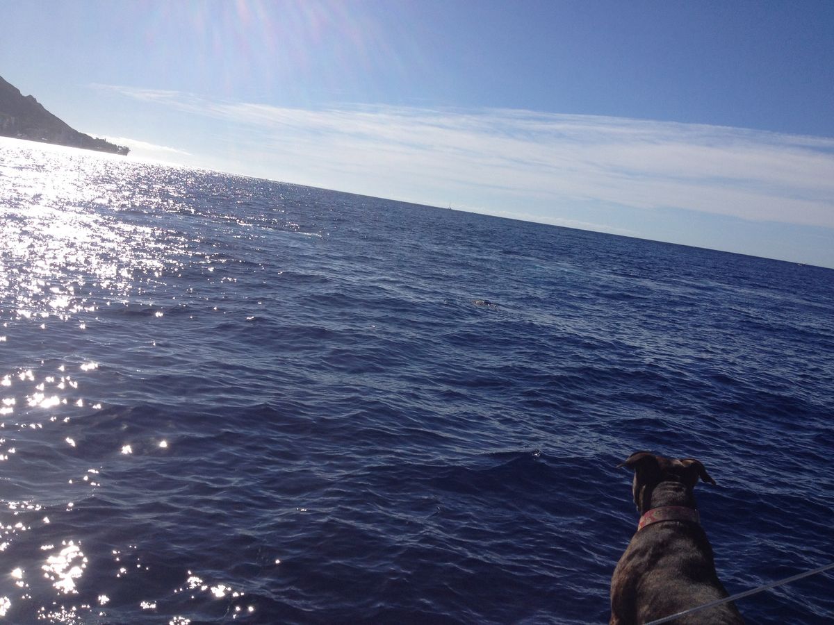 ワイキキ沖の沈潜ダイブ ポイントに移動中イルカのお迎え、船の先端でランデブー!