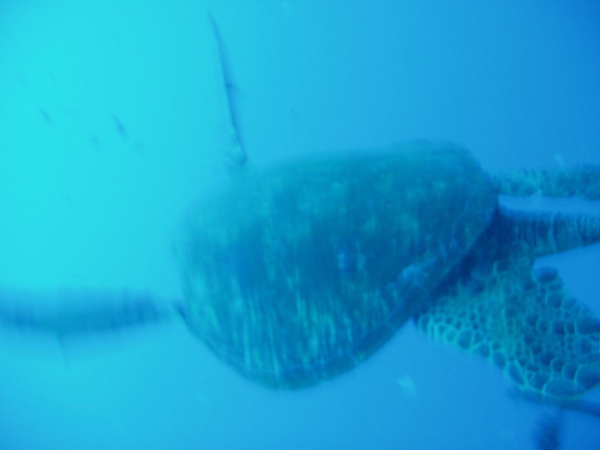 ボートダイビングで、1本目は港から船で10分程度、シータイガー(沈船ポイント)というポイント、最大水深は約30m(沈船の上の部分)となります。潜った途端に船の上にカメが横たわっていました。その他、ネムリフカやトビエイなども見れ、魚影が濃いわけではありませんが、そこそこ面白いポイントです。個人的には、沈船の下まで(40m弱)行きたかったですが、そこは我慢でした。