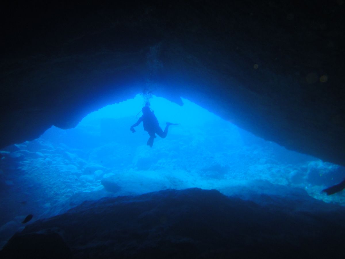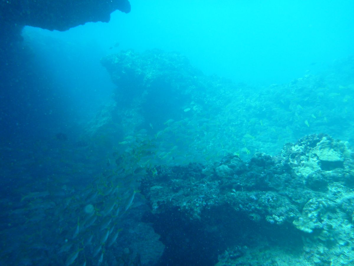 ポイントは上級を絵に描いたようなドリフト&ケーブダイビング。しかも波が荒い…。本来ドリフトは楽なハズなのに、ボートのキャプテンが流れを読み間違えて(というか流れが変わったのか?)流れとは反対の場所でエントリー。あちゃーいきなり進行方向とは逆に流されてます…(^_^;)。もちろんフィンキックなんて無駄。なので目的のケーブ(洞窟)まで壁岩を掴み、腕の力でしがみつきながら行きましたよ。到着した頃には残圧が何時もよりも少なく洞窟へ突入!これまた長い洞窟で途中でエアー切れ起こしたら死んじゃう…なんて考えながら深くゆっくりとした呼吸で進んで行きます。途中サメ(ホワイトチップ)と記念写真も撮りました。