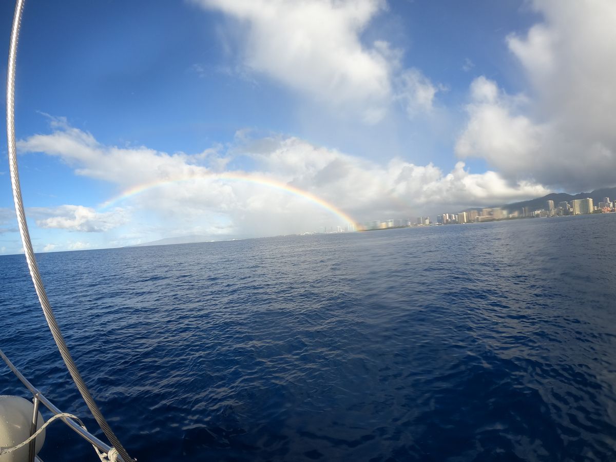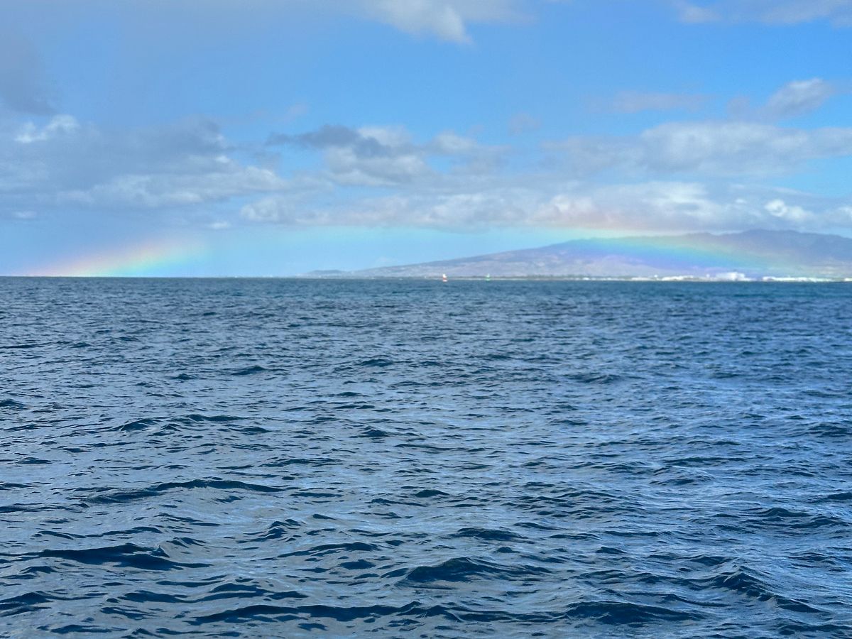 この日はよくウミガメを見ましたが、一度に最大7匹のウミガメがいるのを見たのは初めてで、しかも距離が近く大変興奮しました!ガイドのマットさんがゴープロで撮影をしてくれて、後ほどメールで送ってくれるのですが、すぐ見たいと思いiPhoneのメールアドレスを教えたのですが、エラーが発生して送られてきたのはわかったのですが、見ることができませんでした。パソコンのアドレスを教えれば良かったです。大きな虹が出たのと、イルカの群れが現れたのは素晴らしいサプライズでした。