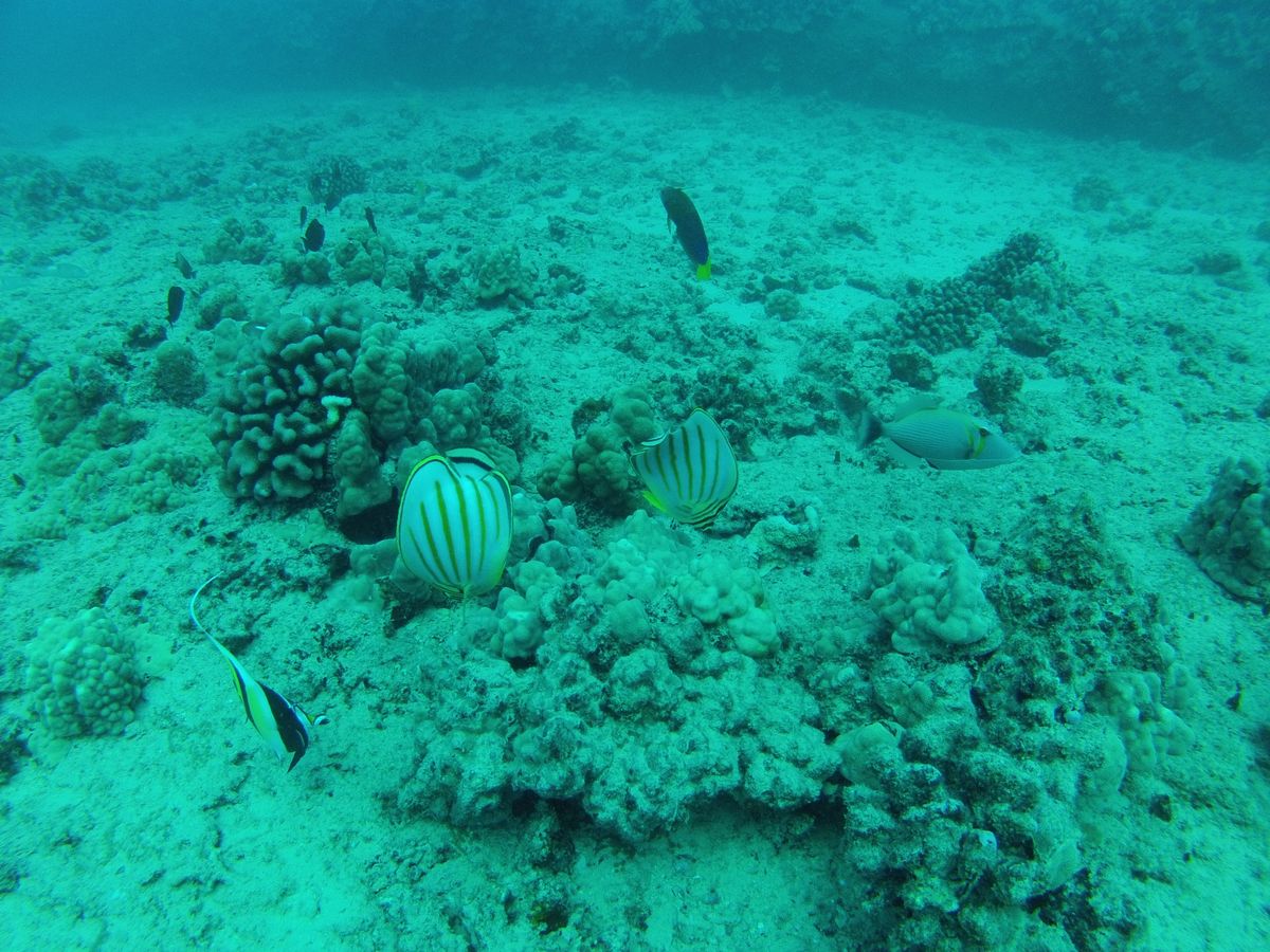 初めてのスキューバダイビングで、彼女と2人で参加しました。その日は客は私たち2人しかいなかったので、インストラクター2人につきっきりで案内してもらいました。アラモアナショッピングセンターの近くから船で15分ほど沖合に出て、そこから潜り始めました。