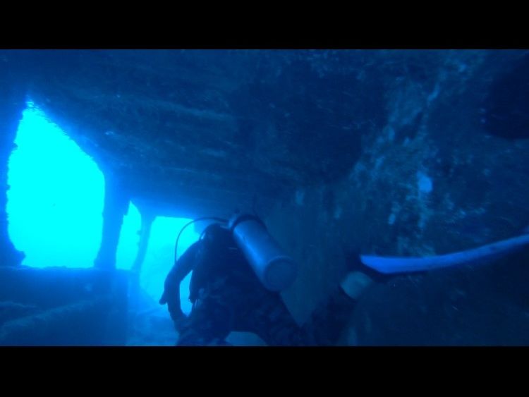 1本目は沈船、水深30m程度、光の差し込みがなく、視界は少し悪かったです。魚影はそこそこでした。寒かった。