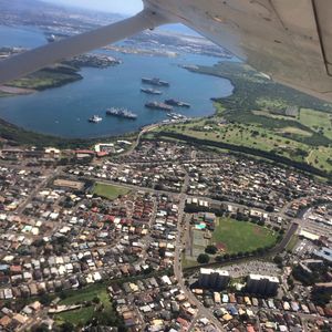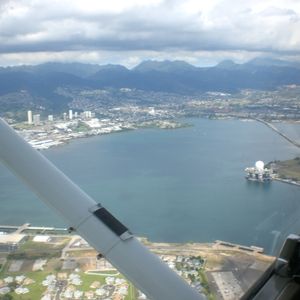 離陸して1、2分経った時点で操縦を代わってくれました。自分の操縦の番になってから間もなく左手にワイキキビーチが見え、ダイヤモンドヘッドのすぐ脇を通り過ぎ、海岸線に沿ってハナウマ湾のあたりまで行って次は内陸の方を通ってパールハーバー上空を通って帰ってきました。この間きっちり30分でした。