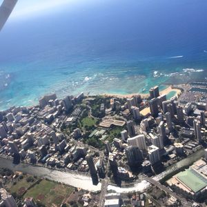 彼女との初海外旅行、当日天気に恵まれ、飛んでるときほとんど揺れなかった、空から見たワイキキビーチ、ダイヤモンドヘッド、米軍基地、体験操縦は本当に体験した方がいいです、感動する、ありがとうございました