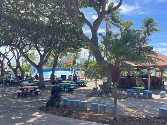 平日はそうでも無いですが土日はランチのオーダーから受け取りまでけっこう並んでて時間を要するので12:00よりも早めに行った方が良いと思います。園内に持ち込めるのは開栓していないボトルウオーター