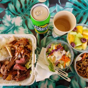 ランチはステーキ、チキンステーキ、フライドポテト、サラダ、フルーツ、ライス…とビュッフェ形式でした。おかわりもできるので、よかったです。
