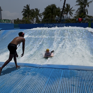 日焼け止めとサングラスは必需品だと感じました。また、日本語が話せる方もいるので安心していけると思います。人工の波でボディーボードが挑戦できとても難しくて面白いのでぜひしてみてください。