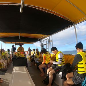 65歳オーバーの母と2人で利用しました。1本がイルカスイム、もう1本が海亀お魚スイムでした。船は屋根があるため日焼けはある程度緩和できます。私たちは酔い止めを飲んだので船酔いはしなかったですが、何名か船酔いされてました。母はスノーケリング経験がなく、心配性でもあるため一応海に入ってみたもののすぐに船に戻り見学、私はスイムに参加しました。結論としては両者とも楽しめました。船の上からでもイルカが泳いだりジャンプして遊んでる様子や、海亀が呼吸しに上がってきたり、魚も水の透明度がよく見えたとのこと。スタッフの方も船上の母を気遣っていただいたようで楽しめたようです。