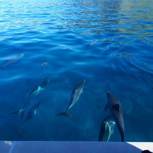 朝早く起きて参加してきました。船で移動中にも何度かイルカの群れに遭遇し、慌ててスマホで撮影^^そしてガイドさんの掛け声でみんな一斉に海の中へ!下を見て!!と言われ見てみると、20頭以上のイルカが群れになって泳いでました。感激でした!後は滑り台に挑戦したり、泳ぎを楽しんだり。私は泳ぎは得意ではありませんが、怖さはありませんでした。ただ、旦那さんが船酔いしてしまい、少し寂しかったです^^他にも何名か気分が悪くなっている方がいました。酔い止めを2錠飲んで行きましたが、泳いでいる際も波にゆらゆら揺れるので、船酔いというか、泳いでいるときに少し気持ち悪くなりました笑
