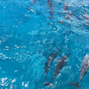 シュノーケリングしながら水の下のほうを泳ぐイルカの群れを