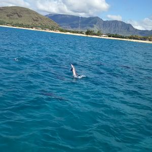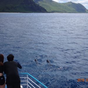 ツアー参加前は、本当にイルカと泳げるのか半信半疑でしたが、本当にイルカと泳げました、というか私の下を30頭ほどのイルカが泳いでいきました。まさかこれほど近くでイルカと一緒に泳げるとは思っていませんでしたのでとても感動しました。また、クジラを船の上から見ることもでき、最後の港に帰る途中で、な・な・なんと!ウミガメにも遭遇することができ、最高の思い出となりました。最後に注意点ですが、2月のハワイは冬の時期ですので、海の中や海から上がった船上はとても寒かったです。(その日は曇りで時々雨も降っていました)また、普段船に乗ることが少ないので船酔いにも注意です。最低でも2時間ほど船に乗りますので、特に子供には酔い止めの薬が必要です。結構みんな吐いていました。またライフジャケットがあるとはいえ、海で泳ぐことも少ないと思いますので、最初からイルカを追って急いで泳がず、体力を残しながらゆっくりと泳ぐことをおすすめします。1回目で見れなくても、スタッフさんが気を使って場所を変えて再度チャレンジしてくれます。(私も2回目でイルカと泳ぐことができました)最低3回は海に入りますので、体力温存がカギとなります。結構、1回目で力尽き、あとは船の上でぐったりとしている方がいました。こうなると船酔いの危険性が高まります。とても楽しいツアーですので、事前の情報収集と体調管理が大切です。いい思い出となりました。