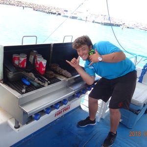 午前9時50分のピックアップで、ゆとりを持ってバスで出発しました。1時間30分後に港に着き、クルーズ開始して目的の場所に着きましたら、早速、亀とイルカの大群を見ることができ、そのうちにくじらも見ることができました。オールキャストに驚き、楽しめました。3月で水は少々冷たかったですが、シュノーケルも楽しめました。BBQランチでは、ビーフパテを船上で焼いていて、パンの上に置いてくれて、やさいなどを自分で盛りつけます。海の上で日差しを浴びて、ナイフとフォークでおいしく頂きました。昼間のビールとハンバーガーは格別でした。船が動いている時の風は少々肌寒く感じますので、1枚長袖を持って行くことをお勧めします。堪能しました。