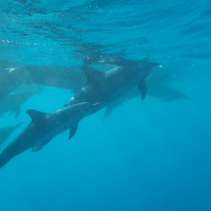 イルカの群れを見つけたら、船で先回りして海に入ってイルカが来るのを待ちます。2回海に入りましたが、イルカの泳ぎが速すぎて見れず。3回目はシュノーケリングでしたが、ウミガメを見て船に戻ろうとしたら、ちょうど自分の下をイルカの群れが通り、うち2頭が水面まで上がってきてくれて、かなり近くで見ることができました。本当に一緒に泳いでいるようでした。意外と波が高かったので、酔い止めは必須です。