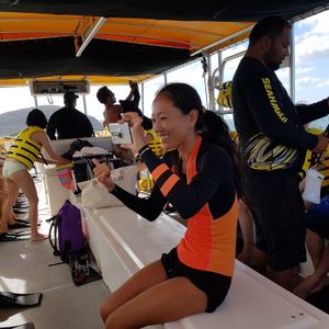 今まで船酔いもしないので、酔止めは飲みませんでしたが、波が非常に高く、シュノーケル中に波に酔ってしまいました。他の女性にはエチケット袋を渡してましたが、私のところは気づかれてないのかわかりませんが、何も渡されず、私自身も聞く余裕もないので海に吐きました。
