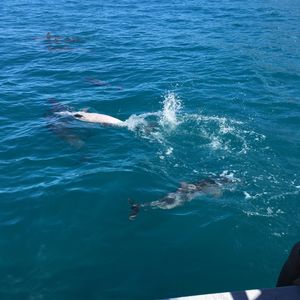 船の上から野生のイルカを見つけて、飛び込みます。ガイドさんについて飛び込みますが