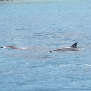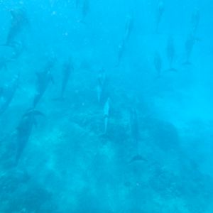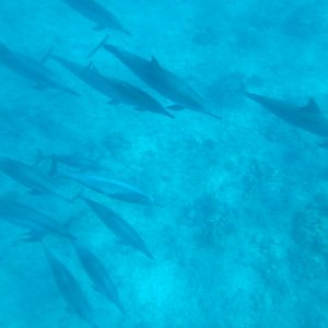シュノーケルで泳いでいると、ガイドさんの「右見て」とか「左見て!」の声を聞いて慌てて見ると、3頭一緒になって泳ぐイルカさんたちがいたり、右の方で水面に出てきてくれたり、、
