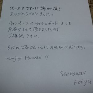 それから、申込み時に『ラッシュガードプレゼント』となっていた事を伝えたら、わざわざ後からホテルまで届けてくれました。温かいメッセージ付きでヾ(*´∇`*)ノ 本当に、ありがとうございます。とても嬉しかったです。次回のハワイ旅行の際にも また申込みます。