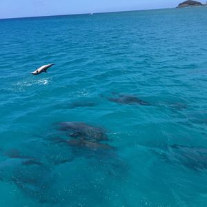 キャプテンやクルーのホスピタリティも最高でした。出航してから30分程でイルカの群れがいるスポットに到着。たくさんのイルカに会えました。船の近くまでイルカが来て、まるでショーのようなジャンプを間近で見れて大満足です。他にもトビウオやウミガメも見れました。
