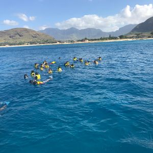 ワイキキとは違って自然たっぷり最高のロケーションの港から出航してすぐにたくさんのイルカがお出迎え♡30頭くらいいたかな。赤ちゃんイルカは飛んだりお腹お見せて泳いでたりして可愛いかったです。最初は船から少し離れて泳いでいたけど…どんどん近づいてきてくれて良かったです。それから30分かけてシュノーケリングポイントまで移動。この日は波が高くて気持ち悪くなるかと思ってたけど、船には酔い止めサプリが用意されててそれを飲んでいたからか船酔いはせずにすみました。助かりました。シュノーケリングでは船の周りで探検しました。なまこ・ウニ・ヒトデなどを触らせてもらえました。初めて触ったから最初は怖かったけど…良い体験でした。1時間くらい楽しんで港に帰る途中にまたイルカがお出迎えしてくれました。ラッキーな日となりました。最後にはウミガメが3頭待っててくれて