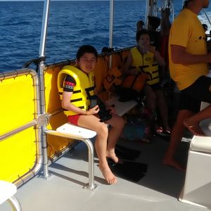 船上では、他に船長や白人系のかわいい女の子と結婚したばかりの男性がいて、仲間同士とても仲良く楽しそうにしていました。息子がシュノーケリングが初めてで緊張していると告げると、「自分たち4人が一緒に海に入るから、何かあったら助けるからね!」と話しかけてくれてました。