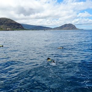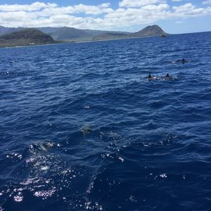 ハネムーンでハワイの海や自然を満喫したいと思いこのツアーを選びました。野生のイルカは95%の確率でみることができるとガイドさんからも説明を受け、実際に海で泳ぐイルカをみることができとても満足でした。日本語を話せるガイドさんがいてイルカの動態なども説明してくれました。シュノーケルは40分程度でしたが、あまり魚は見つからず。その代わりウミガメを発見しました。BBQはあまりおいしくなかったです。お肉がぱさぱさ。その代わりシュノーケル後に用意してくれていたパイナップルがとってもおいしかったです。ガイドさんが安全面を気にかけてくれていたため安心できました。イルカは年中見ることができるようで、泳いでいる姿をみると水族館でみるのとはまた違う感動があります。たくさん海中で泳いでいて、たまに回転したりするのでそれにも感動。冬のシーズンになれば、イルカのほかにクジラもみることができるようなのでまた参加したいと思いました。