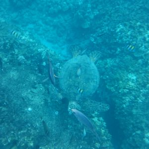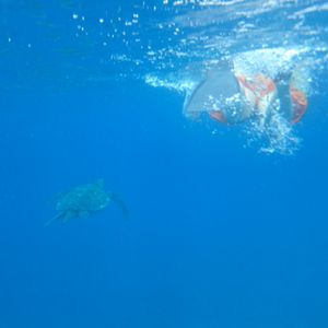 私たち二人にとって素晴らしい一日でした。残念ながら、シュノーケリングには苦労しましたが、スタッフから無理に続けるように圧力をかけられることはありませんでした。私のボーイフレンドはシュノーケリングとスヌーバで素晴らしい景色を見ました。ウミガメも見ました(写真参照)。私たちは無料の飲み物(アルコールを含む)をいただき、ランチはチキンまたはプルドポークのサンドイッチで、とても美味しかったです。スヌーバのインストラクター、キャメロンはとても親切で情報豊かで、私たちに楽しい旅行を提供しようと最善を尽くしてくれました。