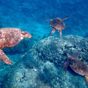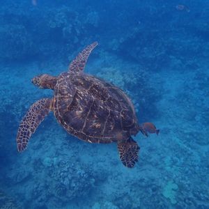 次は海ガメがいるというスポットでシュノーケリングです。大きな岩の上に大きな海ガメが休んでいました。息継ぎのタイミングにも遭遇でき、海ガメが上がってくるときに間近で見ることが出来ました。