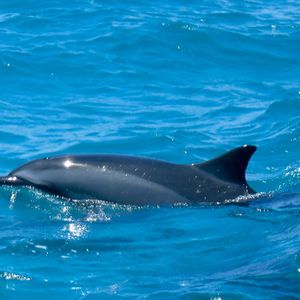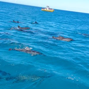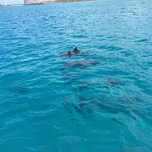 イルカがたくさんおり、わたしたちの周りをぐるぐるまわって泳いでくれます。