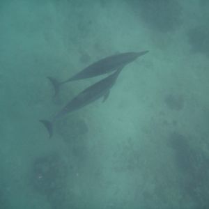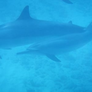 イルカの近くで2回シュノーケリングをしましたが、1回目はシュノーケルが壊れていてどうしても水が入ってしまい、それに気を取られてイルカをよく見れませんでした。2回目のときはシュノーケルを交換してもらい、しっかりとイルカを見ることができました。水中のイルカたちは泳いでいるだけでなく、じゃれて遊んでいる姿もあり、初めて見るその姿に感動しました。