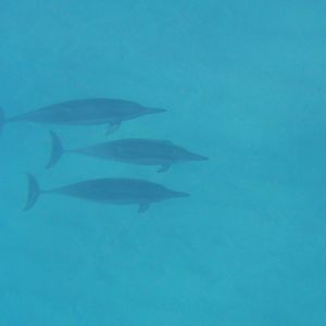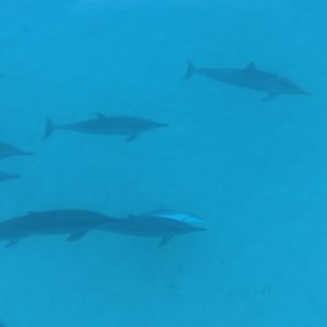 イルカがたくさんいる場所に船で行き、他のツアーと重ならないように時間をずらして海に入りました。イルカを見つけると、「した、した」と日本語で言って教えてくれます。何回も遭遇し、たくさんのイルカがいました。