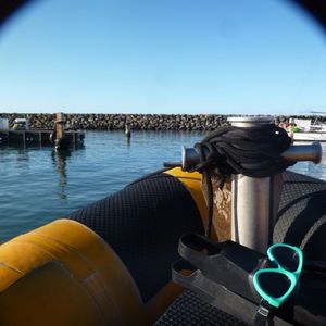 ハーバーに到着し、上半身のウェットスーツを貸してくれます。ビーチサンダルを脱ぎ、ライフジャケット・フィン・を貸してくれ、レディーファーストでボートに乗り込みます。カップルは前方、女性グループは後ろの席に乗り込みます。後ろの席は荷物を4人掛けの椅子の下に入れるので、必要なものは出していた方がいいです。