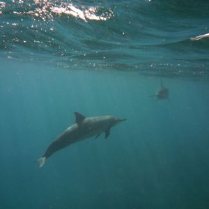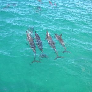 港に着いたら15分間のトイレ休憩を取り、いよいよボートに乗り込んで出発です。走り出すと、ラッキーな事に即イルカとご対面でした。そして、イルカの居そうなポイントに着くと「はーい、みなさん海に入りましょう。」とスタッフの方。心の準備も何も無いまま海へドボーン。ちょっと泳ぐとイルカさん達が泳いでいました。