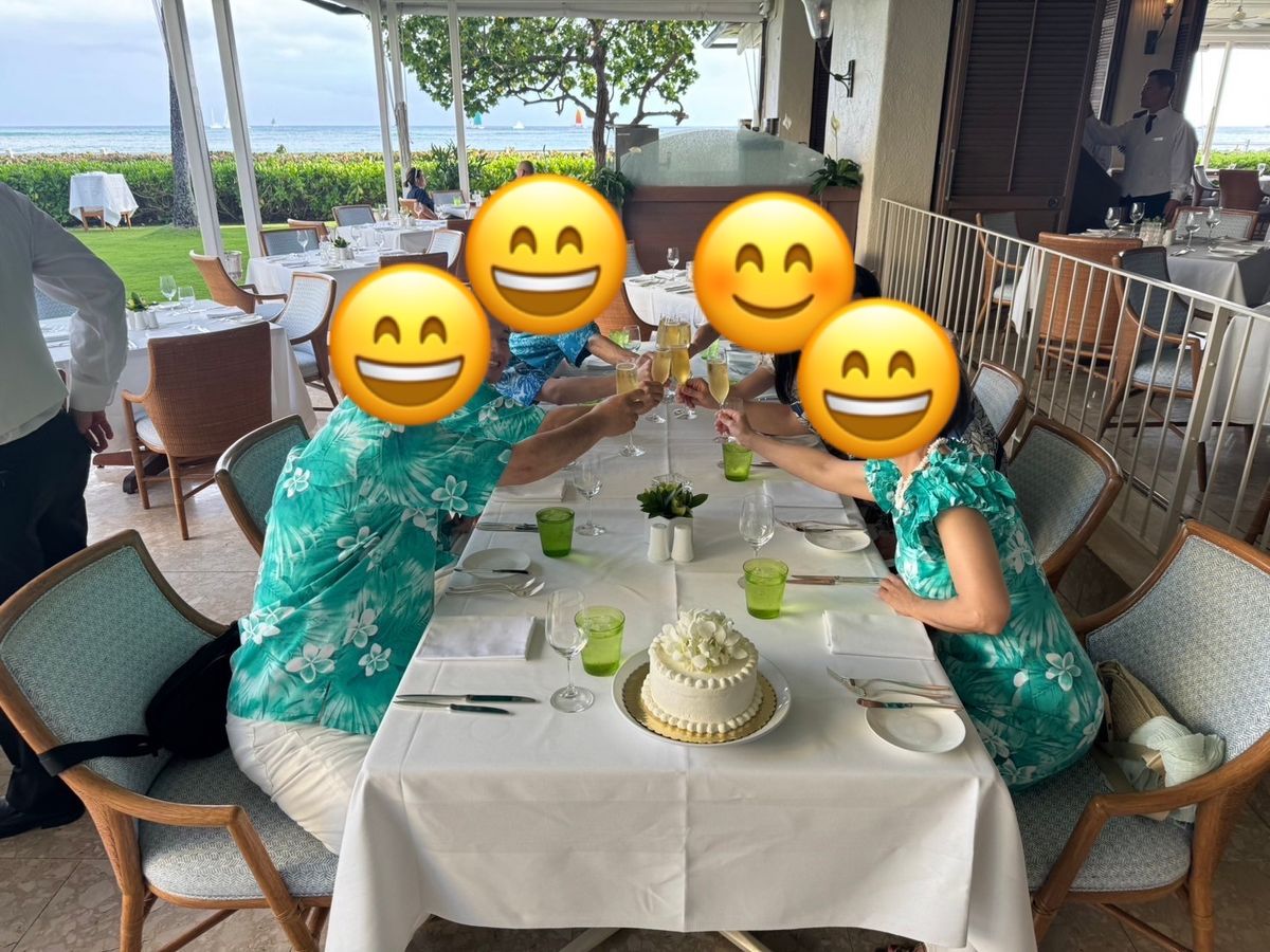 オアフでの結婚式を午前中に終え、サンセットフォトツアーとサンセットディナーで迷いましたが、参列した皆と良い思い出を作りたいと思い、食事会にしました。